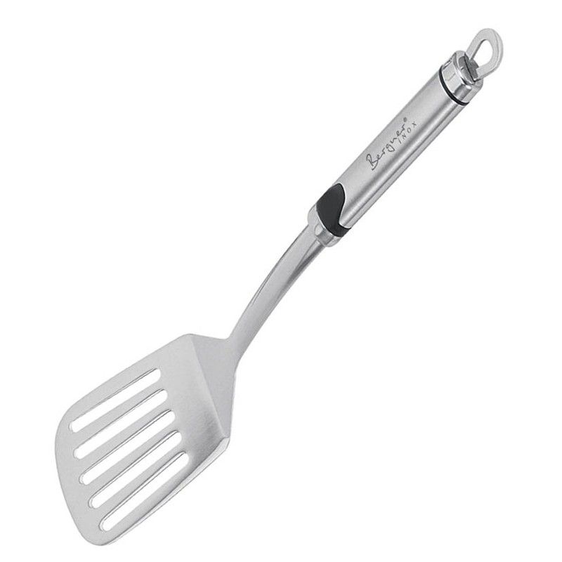 Acier inoxidable. Poignée de forme ovale et trou pour accrocher. Facile à nettoyer.
