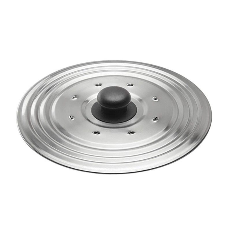 Acier inoxydable très robuste. Avec des trous pour la sortie de vapeur. Adaptable à différentes tailles. Bouton en bakélite thermo-isolant.