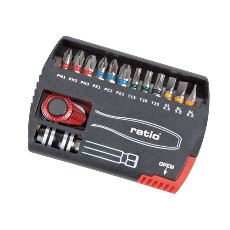 Mallette 14 accessoires. Mini clé à cliquet réversible pour embouts de tournevis. Adaptateur magnétique à ajustement rapide. Embouts de torsion en acier S2 avec bague colorée.
