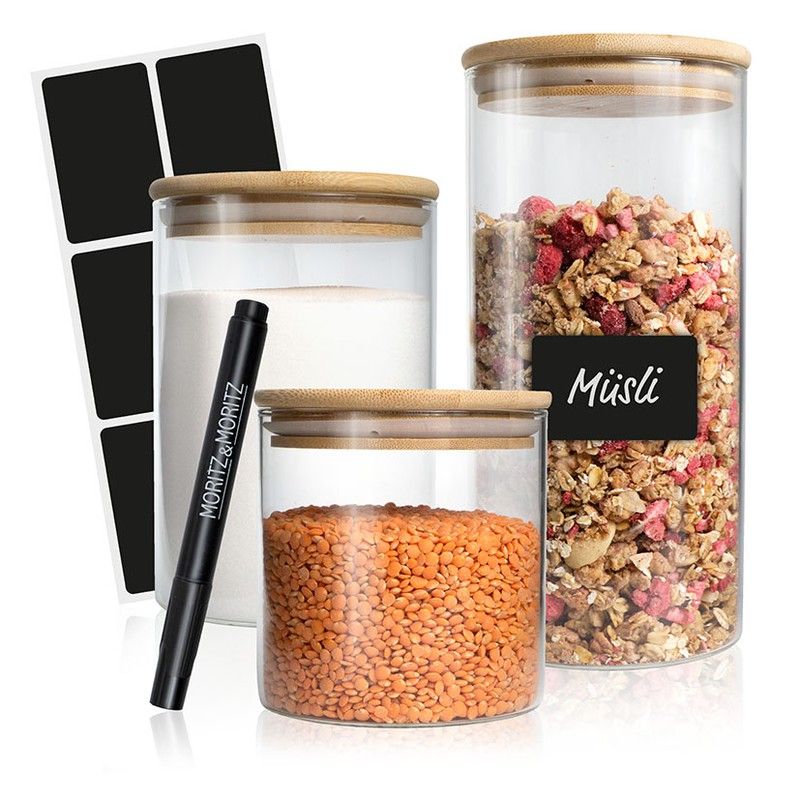 3 bocaux en verre borosilicate 100 % résistant, compatibles lave-vaisselle et micro-ondes ; couvercle en bambou avec joint en silicone intégré ; 6 étiquettes adhésives tableau noir et 1 crayon craie.