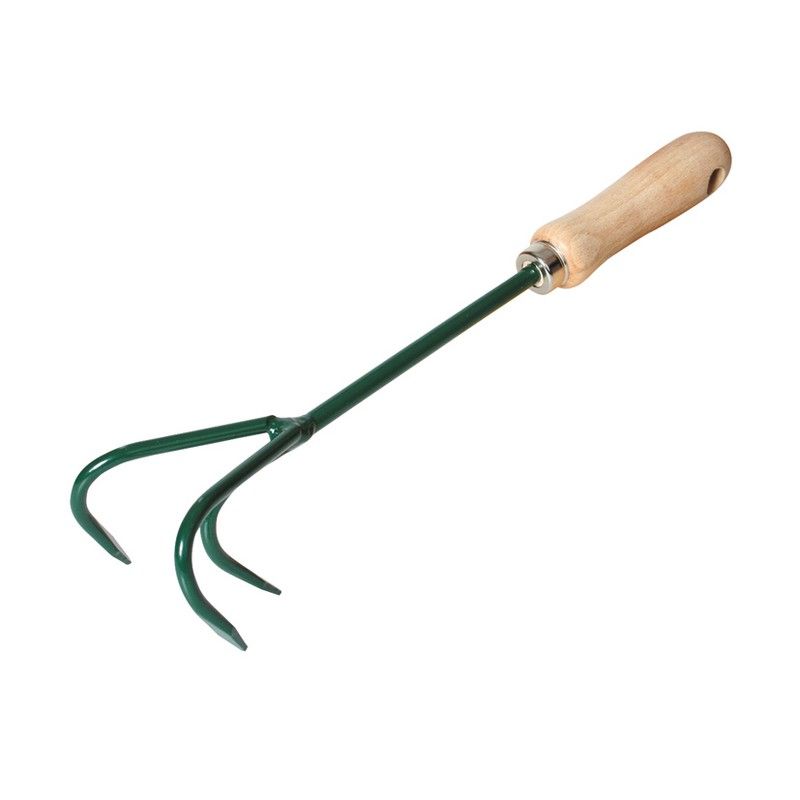 Acier peint époxy. Manche en bois verni fixé avec une virole en métal.