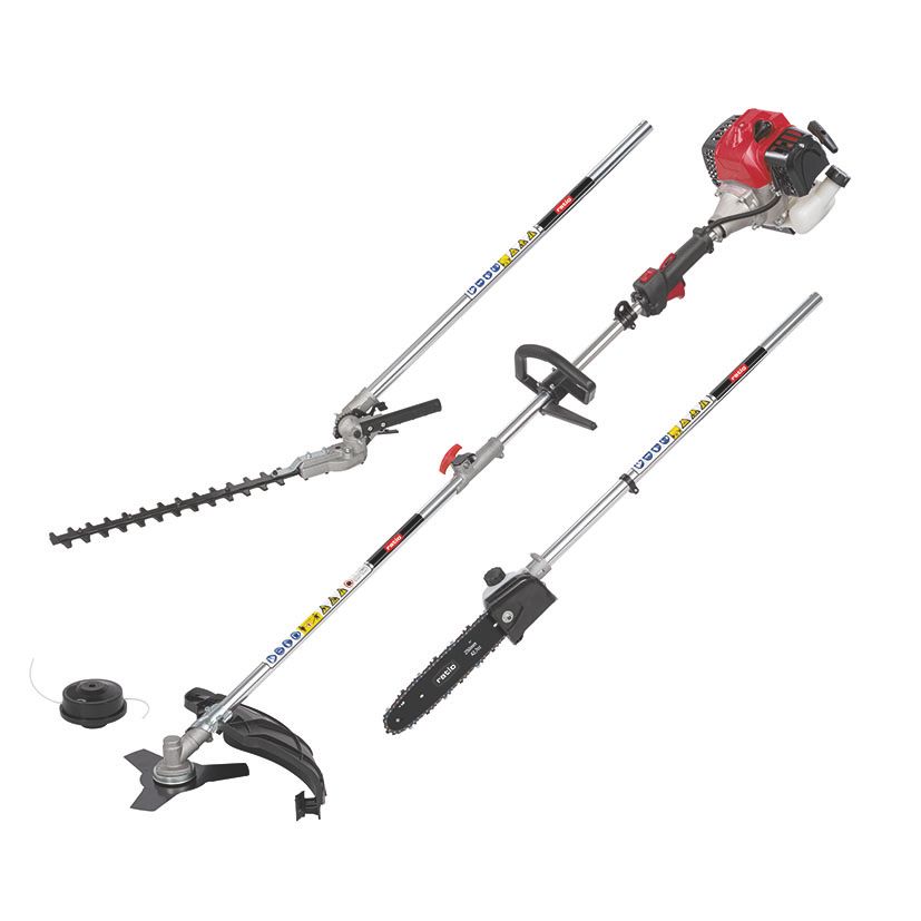 Plus d'informationsDébroussailleuse 4 en 1 : taille-haie, tronçonneuse, débroussailleuse et coupe-bordures. Moteur 2 temps. Démarrage facile. Système anti-vibration. Régulateur de vitesse avec interrupteur de sécurité. Tête réglable. Harnais inclus. 114 dB. Cylindrée : 42,7 cm³. Lame du taille-haie : 255 mm. Guide-chaîne de la tronçonneuse : 250 mm. Débroussailleuse : ø 255 mm. Guide-chaîne du taille-haie : 430 mm. Réservoir de carburant : 850 ml. Dimensions : 27 x 15 x 111 cm.