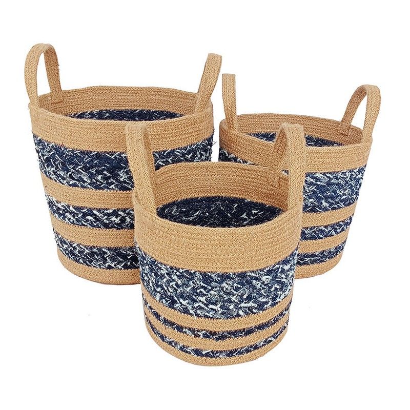 Panier Cylindrique Jute/Coton 3 Un. Corbeille Istanbul en fibre naturelle Ensemble de 3 éléments cylindriques avec poignées. Bicolore. Jute et coton recyclé bleu et blanc. Petit panier : ø 20 x h.18,5/27 cm. (avec poignées)\r\nPanier moyen :a ø 22 x h. 22/30 cm. (avec poignées)\r\nGrand panier : ø 25 x h. 25,5/24 cm. (avec poignées)