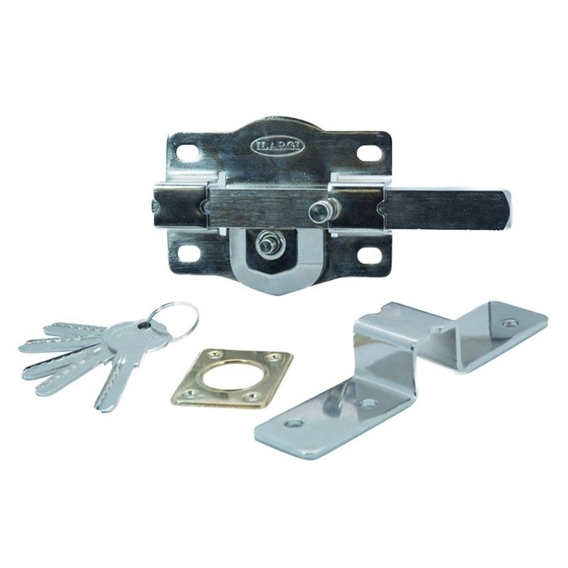 Cylindre de sécurité externe et bouton interne. Barre en acier calibrée de 18 mm. Plaque en acier de 2 mm. Gâche en acier de 3 mm. Boîtier de 105 mm. Finition en fer émaillé haute résistance. Comprend 5 clés.