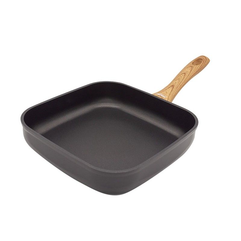 Aluminium forgé Revêtement antiadhésif, Xylan 2 couches. Sans APFO. Manche imitation bois doux au toucher. Convient à tous les types de cuisines, y compris l'induction. Lave-vaisselle.