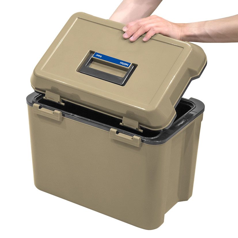 Polypropylène moulé. Joint hermétique. Poignée de transport et verrou de sécurité.