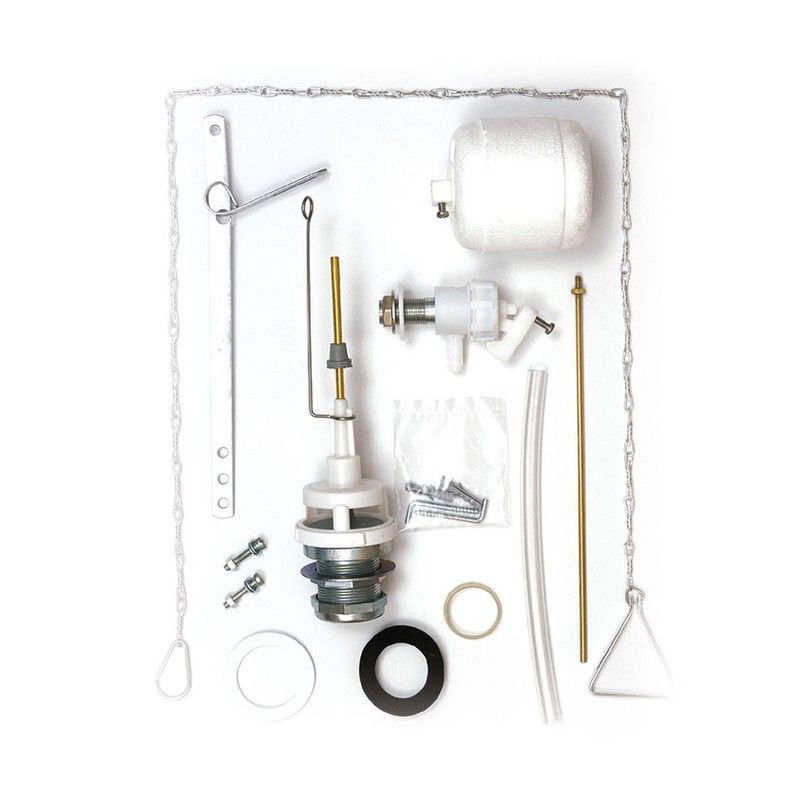 Équipement complet : Vanne de chasse d’eau avec joints. Robinet 3/8" avec tige et flotteur. Vis. Levier. Chaîne et poignée de traction. Équerres et crochets.