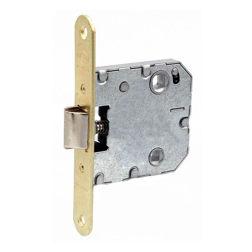 Convient aux portes de passage ou de sécurité. Bord arrondi. Plaqué laiton. Entraxe de 47 mm.