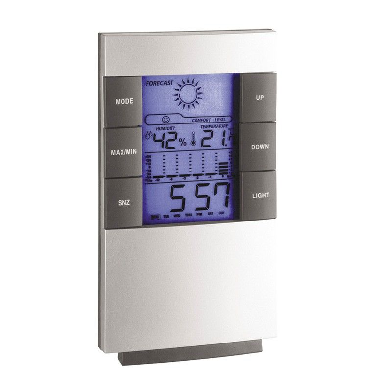 À l'intérieur. Prévisions météo à l'aide de symboles. Graphique de température historique des 12 dernières heures. Température et humidité intérieure, mémoire max/min. Indication du niveau de confort. Calendrier et réveil. Écran avec lumière.