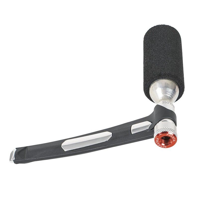 Design compact. Contrôle du flux d'air en tournant la cartouche. Convient aux valves Presta et Schrader. Convient aux cartouches de CO² 16 gr avec filetage. Démonte-pneus en aluminium et protecteur en plastique pour éviter d'endommager le bord des jantes.