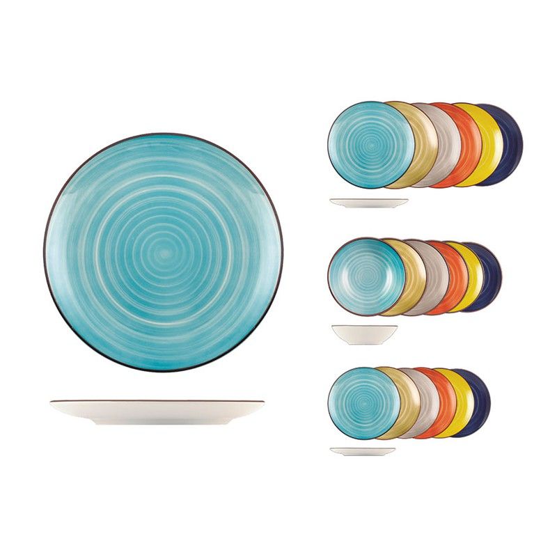 Porcelaine multicolore 18 pièces. 6+6+6 assiettes de couleurs différentes. 6 assiettes plates ø 26 cm. 6 assiettes creuses ø 20,5 cm. 6 assiettes à dessert ø 20 cm.